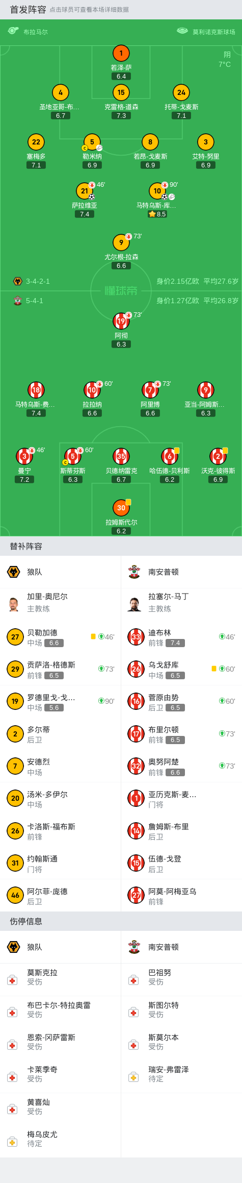 狼队2-0南安普顿,马特乌斯-库尼亚传射,萨拉维亚闪击