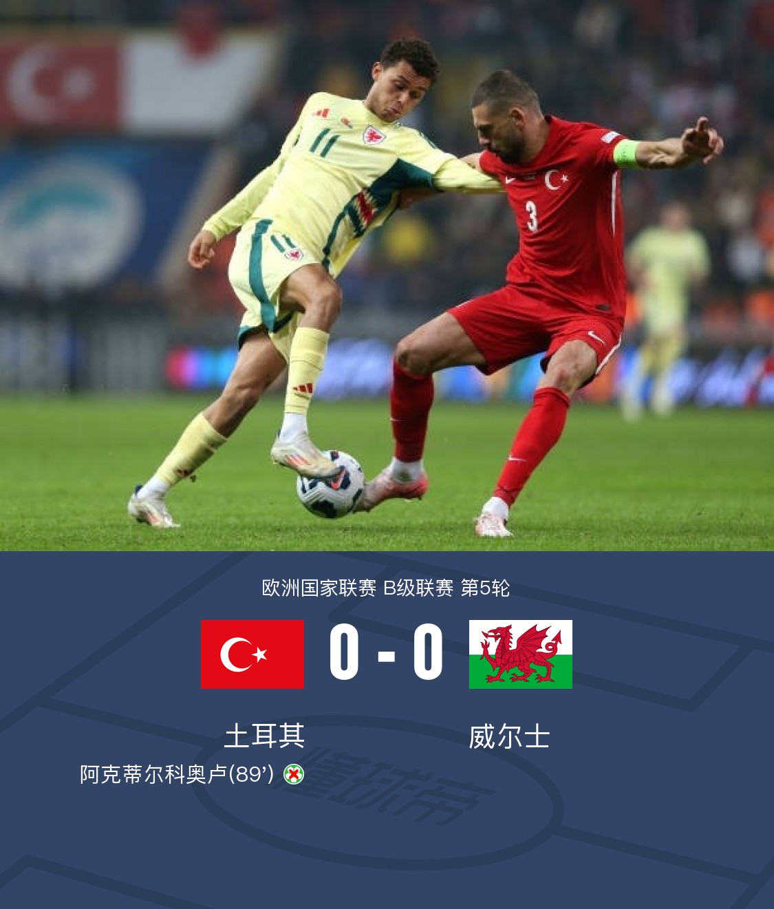 在欧洲国家联赛B级联赛的一场较量中,土耳其迎战威尔士。上半场,乔丹-詹姆斯破门,但是因助攻队友越位在先被判无效。下半场最后时刻,土耳其获得点球,阿克蒂尔科奥卢主罚击中立柱弹出。全场比赛结束,土耳其0-0战平威尔士。