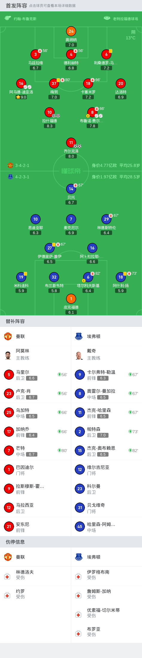北京时间12月1日晚间21:30,英超联赛第13轮,曼联坐镇主场老特拉福德球场,迎战埃弗顿,本场比赛主裁为约翰-布鲁克斯。上半场,迪亚洛兜射失良机,贝托造险,拉什福德破门,迪亚洛抢断布兰斯韦特,齐尔克泽扩大比分。下半场,拉什福德闪电破门,迪亚洛抢断后助攻齐尔克泽完成梅开二度,勒温头球制造威胁。最终,曼联4-0埃弗顿。