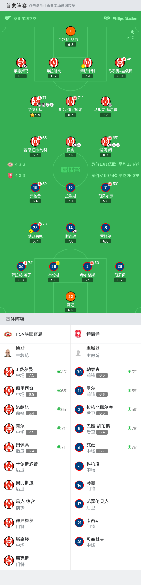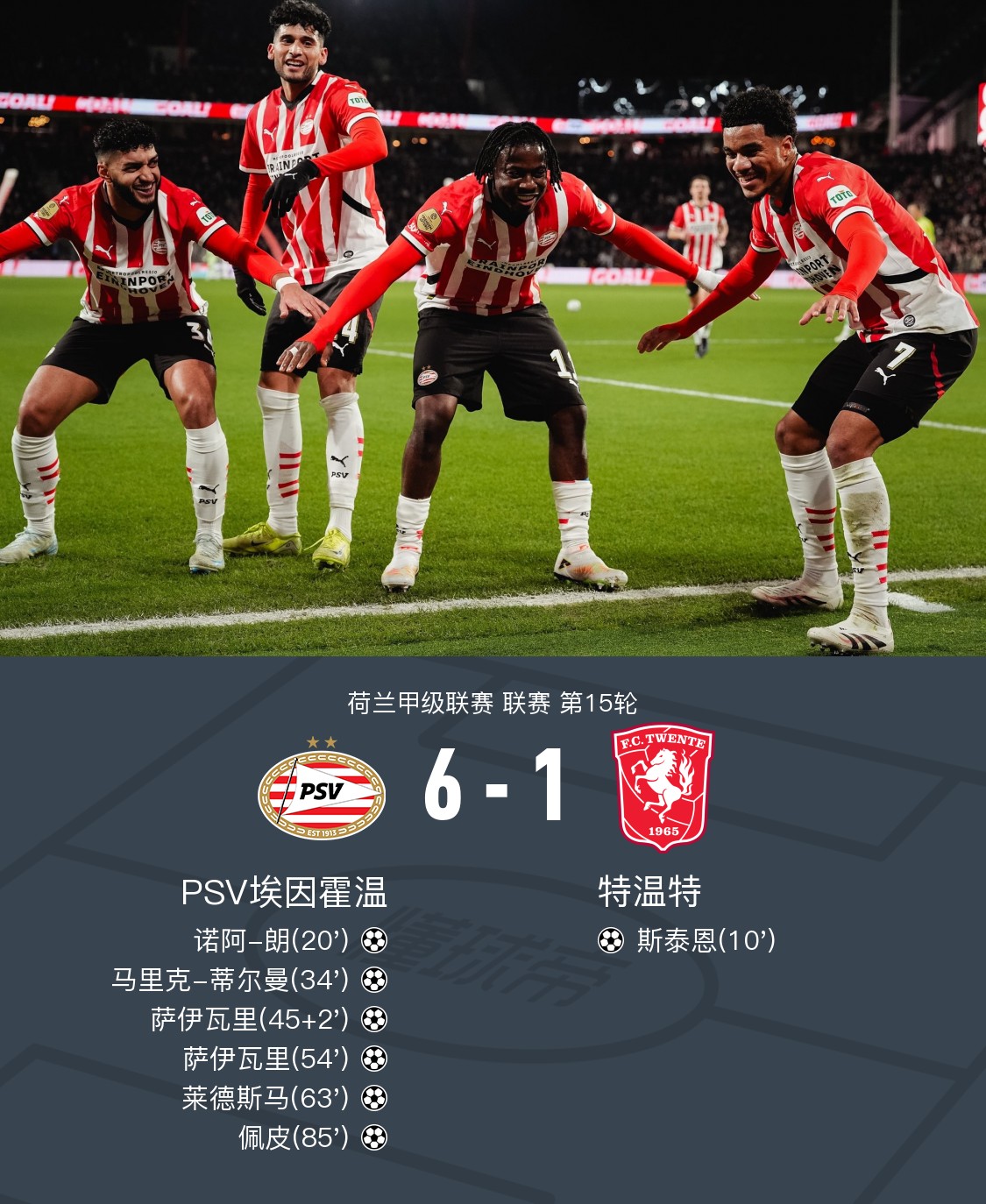 埃因霍温6-1特温特,萨伊瓦里两射两传,诺阿-朗独造3球