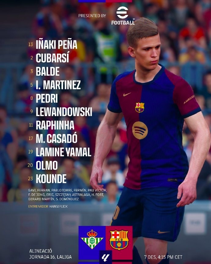 巴萨客战贝蒂斯:亚马尔、莱万首发,奥尔莫、佩德里出战