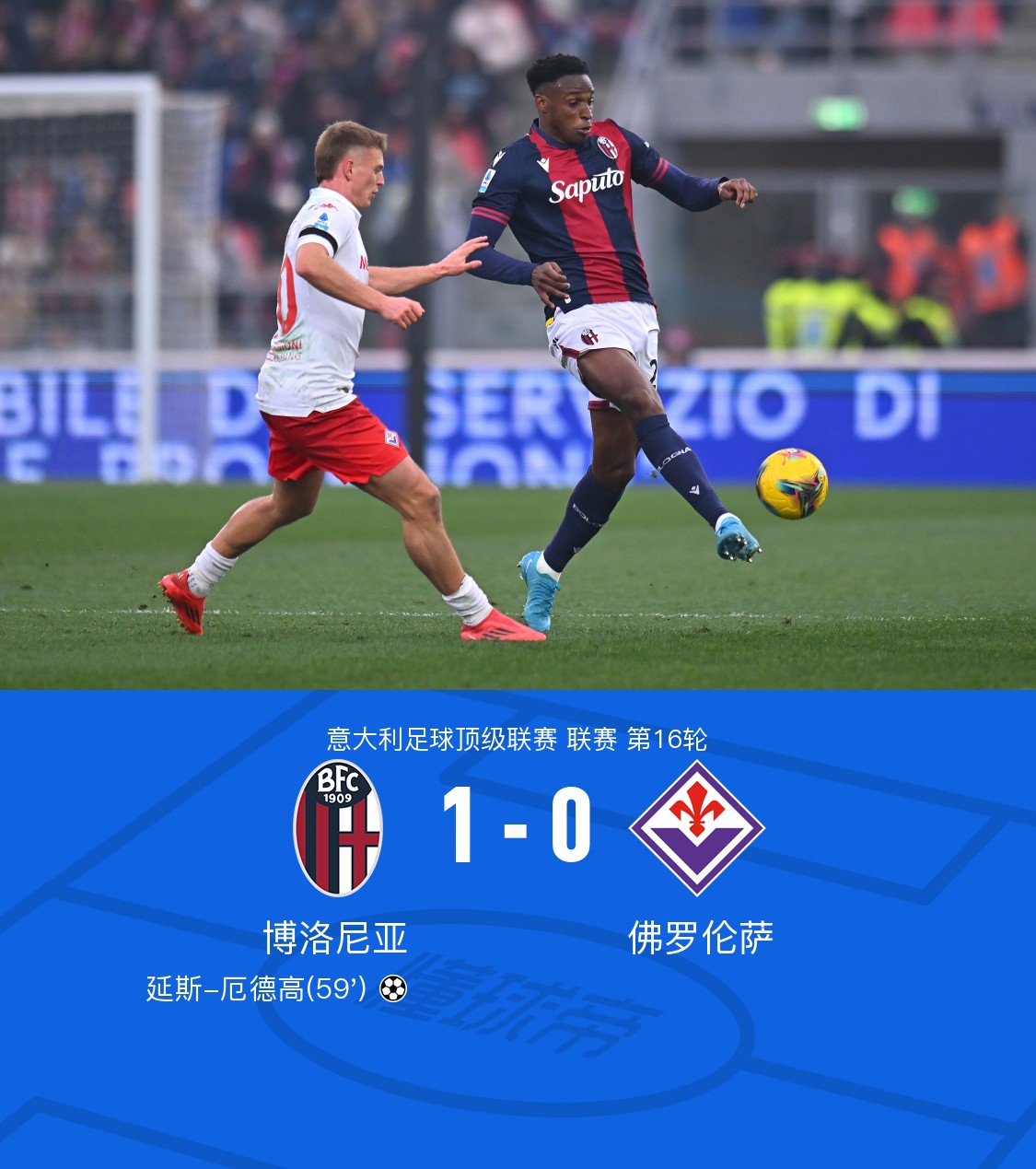 第59分钟,弗罗伊勒助攻,延斯-厄德高推射破门,博洛尼亚1-0佛罗伦萨