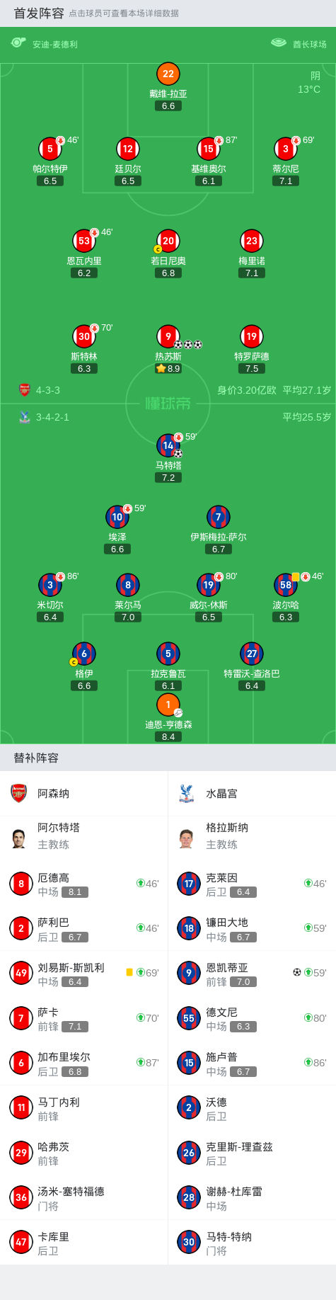 第71分钟,阿森纳进行人员调整,萨卡换下斯特林