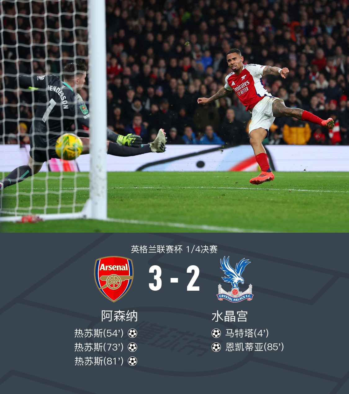 英联杯阿森纳3-2水晶宫晋级4强,热苏斯戴帽,厄德高助攻双响