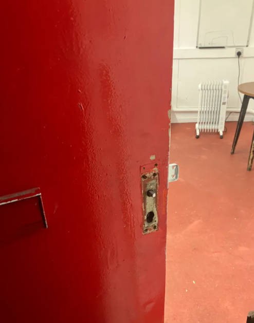 热刺队更衣室的门已经破旧不堪,门上还配有一个信箱,但由于气温骤降,门钥匙断裂了,所以还需要换一个全新的门把手和门锁。