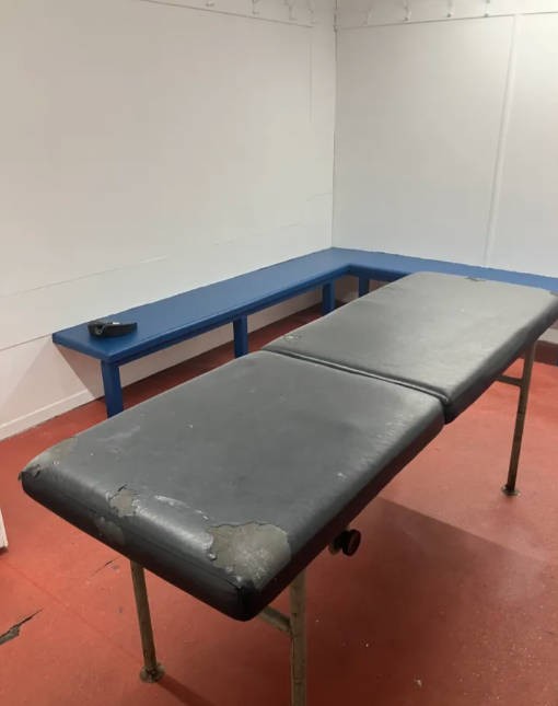 据报道,塔姆沃思Lamb Ground球场的客队更衣室是一个小小的房间,里面有一张L形长凳、一张破旧的按摩床、一块摇摇晃晃的战术板、一个塑料箱和一台便携式电暖器。