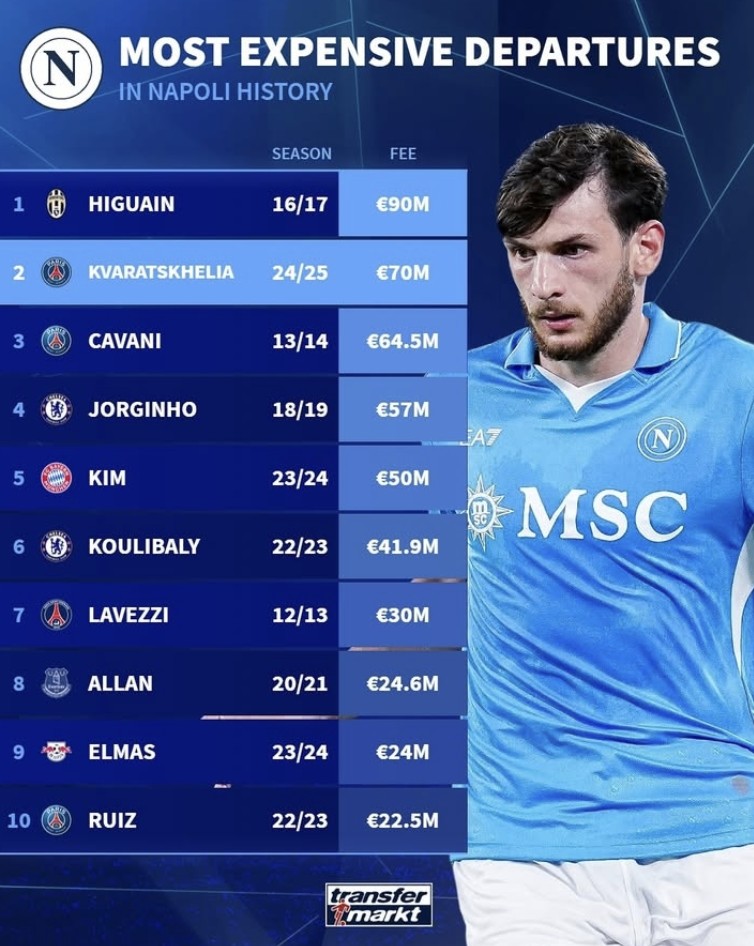 1月18日,德国转会市场列出了那不勒斯队史出售球员价格排行榜。其中,伊瓜因9000万欧居首,克瓦拉茨赫利亚7000万欧第二。