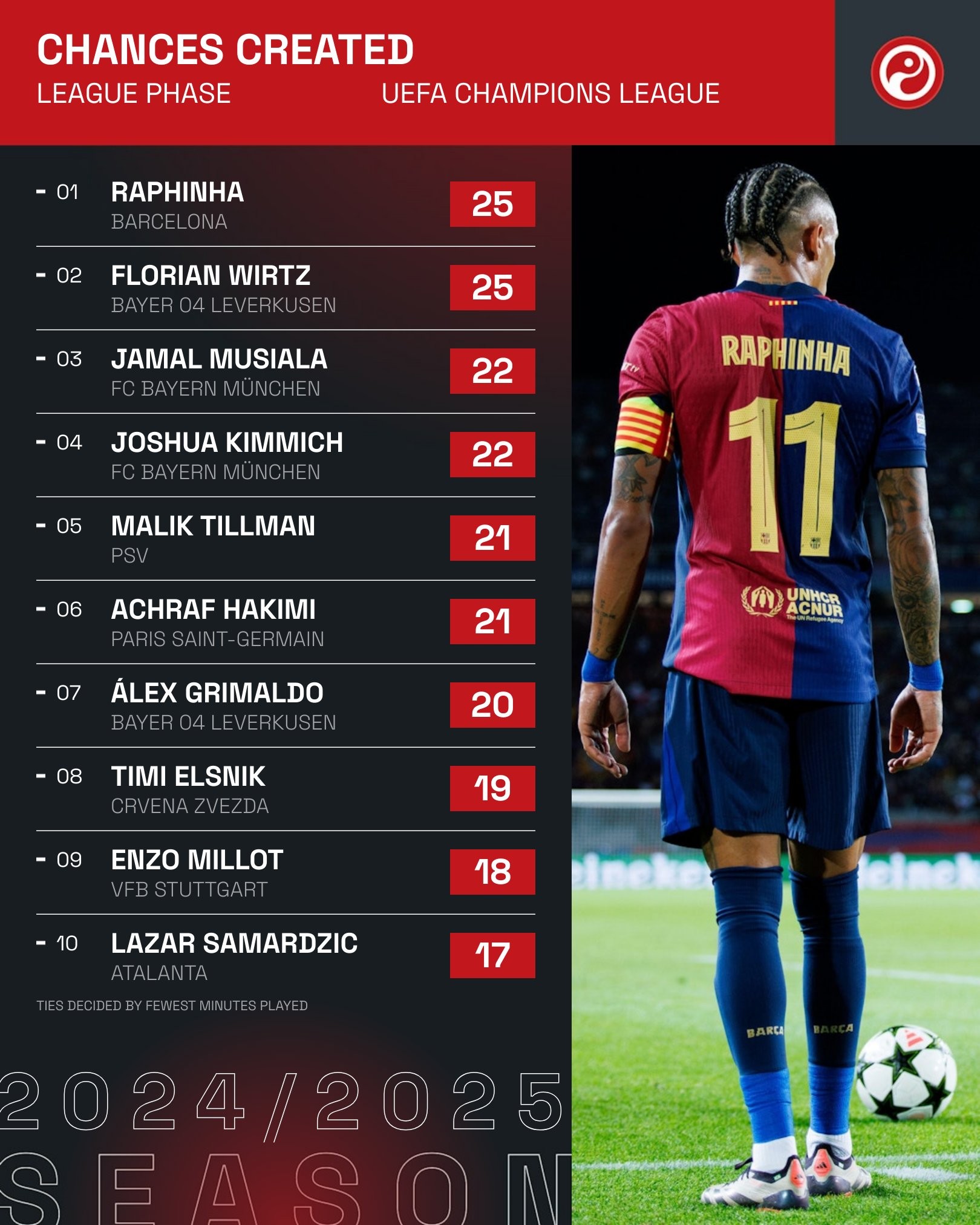 欧冠联赛阶段创造机会榜:拉菲尼亚、维尔茨25次并列第一