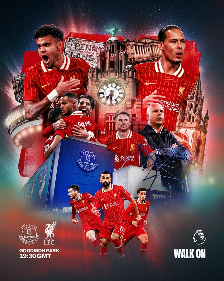 利物浦官方在社交媒体上晒出了本场比赛的预热海报,并配文:“在古迪逊公园的最后一场默西塞德德比”,海报当中,路易斯-迪亚斯、范戴克、加克波、索博斯洛伊、麦卡利斯特、斯洛特、罗伯逊、萨拉赫和柯蒂斯-琼斯出镜,背景是古迪逊公园球场。