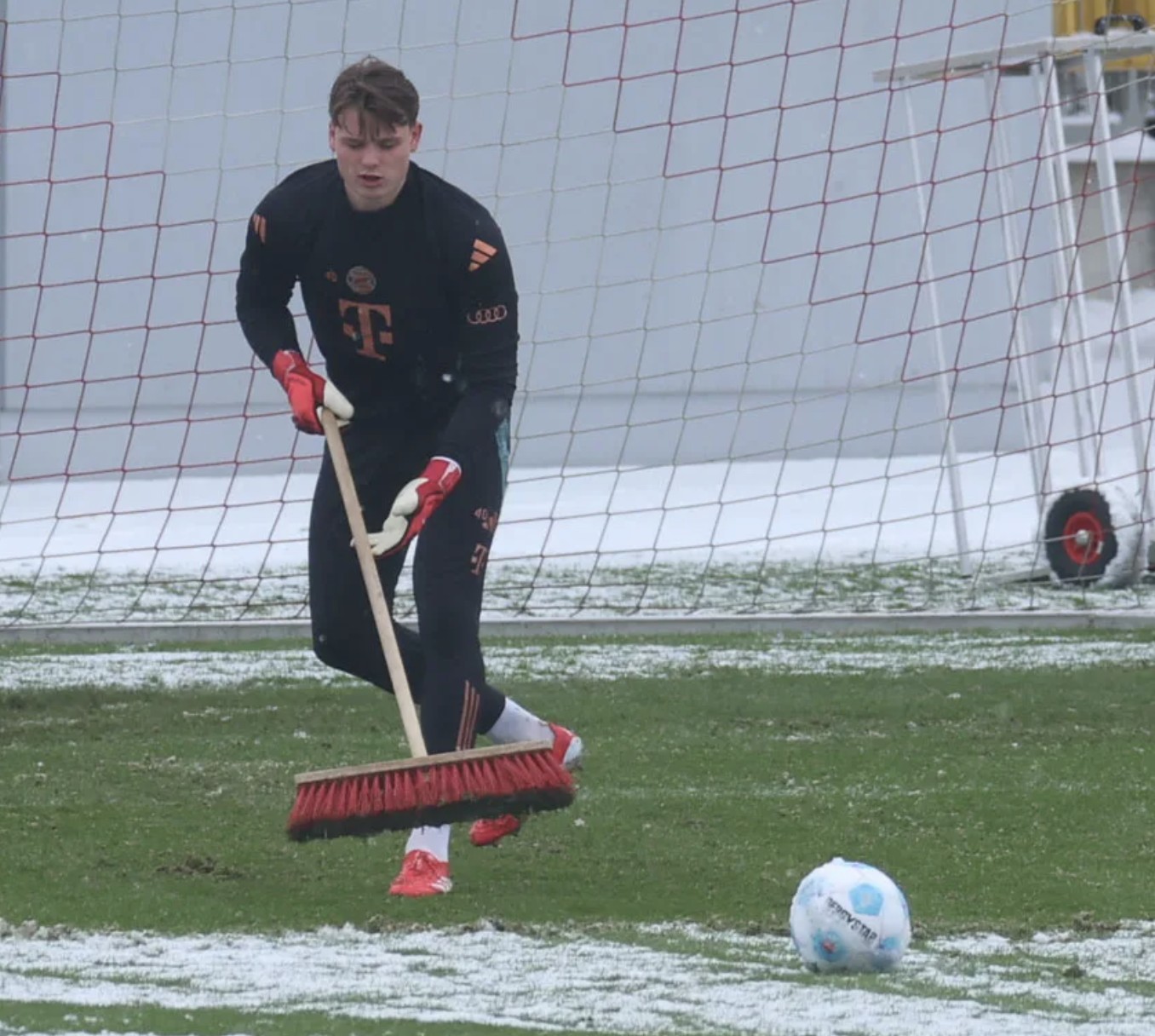 由于周日慕尼黑遭遇了猛烈的降雪,拜仁的训练场被积雪覆盖。这样一来,进行专业的门将训练显得不太可能。于是,乌尔比希与门将教练迈克尔-雷赫纳一起,用扫帚清除了球门前的积雪。