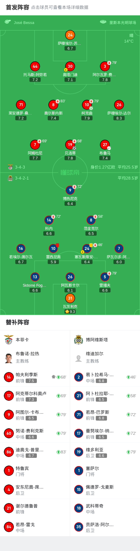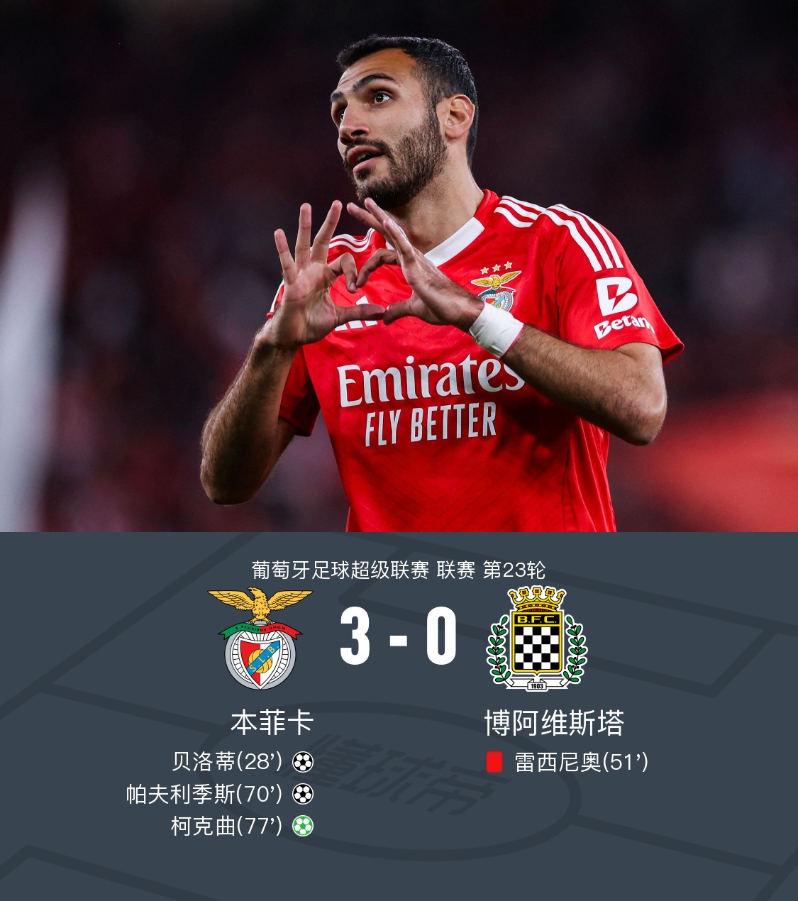 本菲卡3-0十人博阿维斯塔,贝洛蒂、帕夫利季斯、柯克曲破门