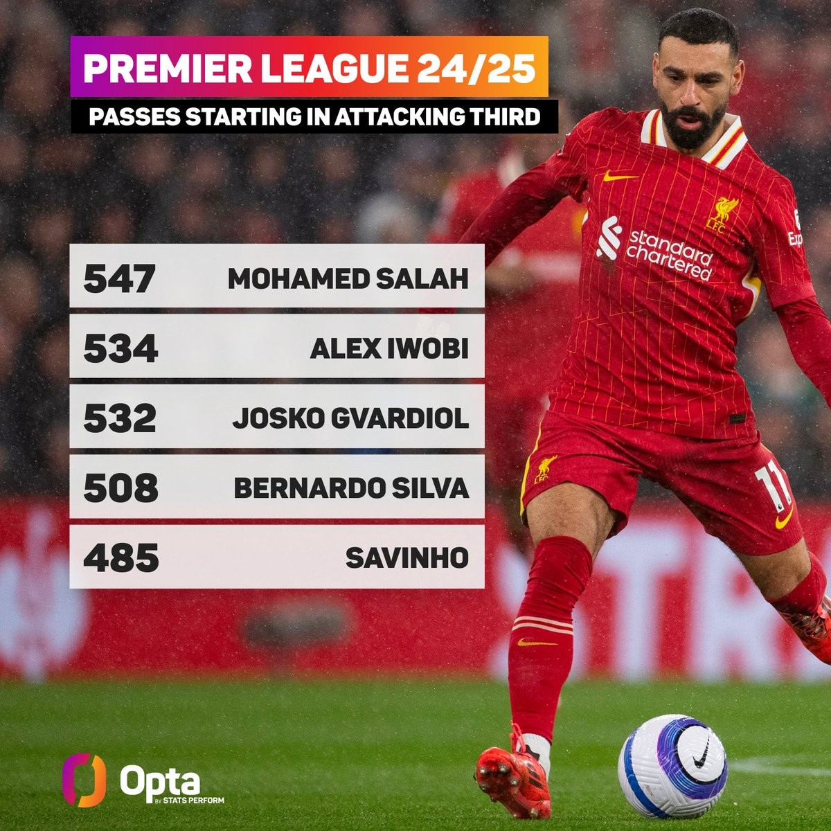 据Opta统计,萨拉赫本赛季在英超完成了547次从进攻三区发起的运动战传球,为所有球员中最多。