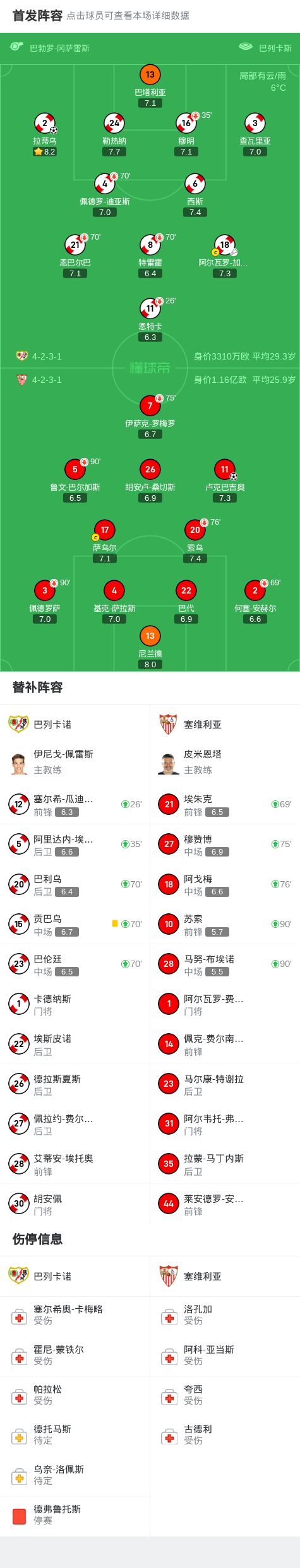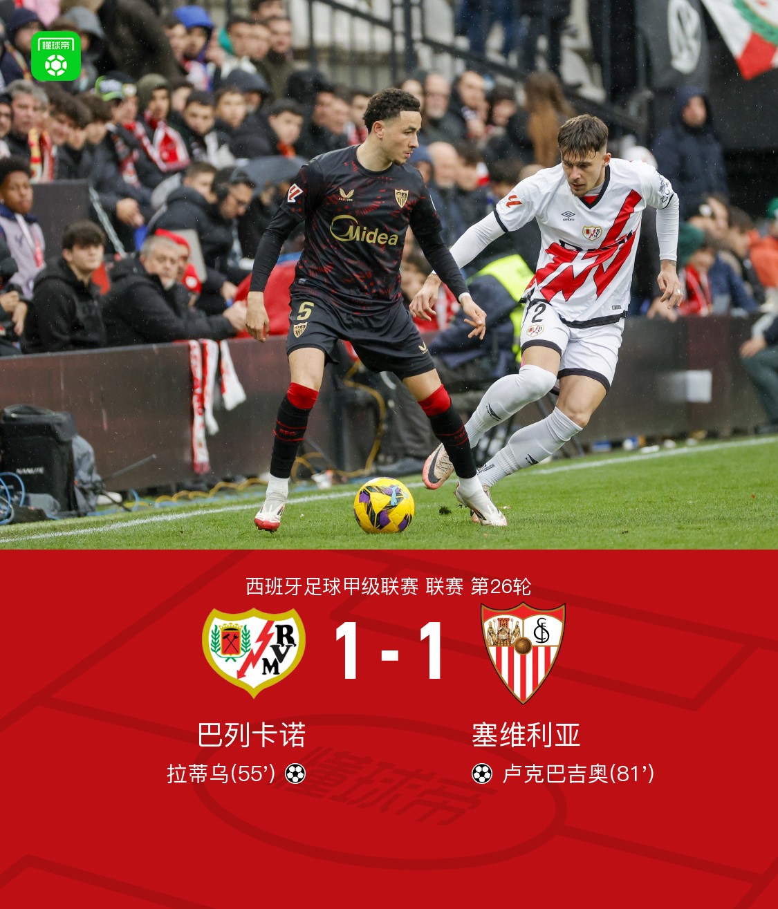 巴列卡诺1-1塞维利亚遭3轮不胜,拉蒂乌破门,卢克巴吉奥建功