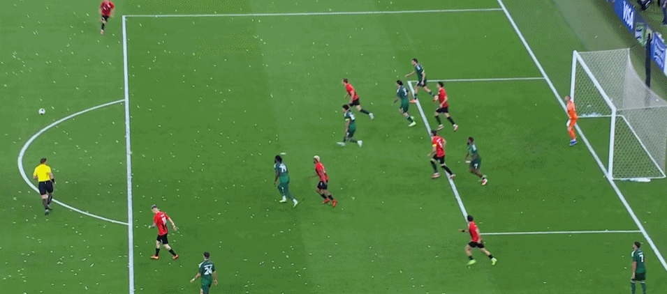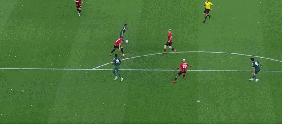 第25分钟,贝加禁区外兜射,皮球偏出底线