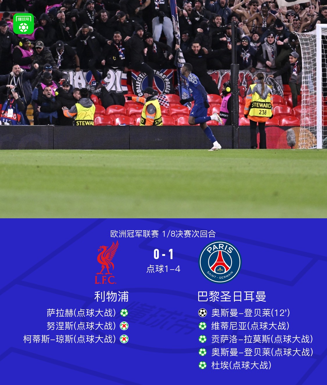 巴黎两回合1-1点球大战4-1淘汰利物浦,多纳鲁马两扑点