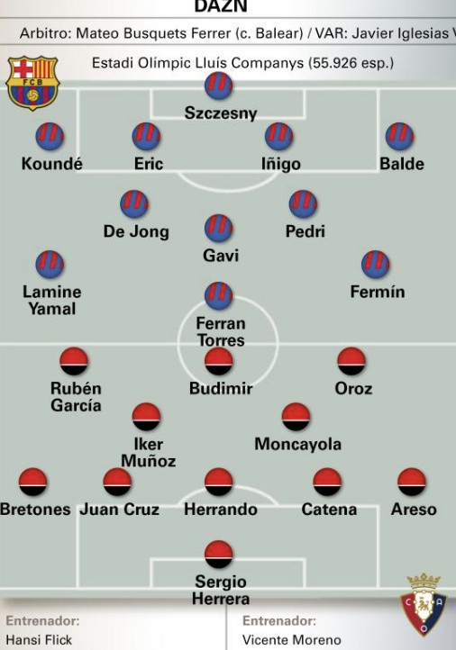 北京时间3月28日凌晨4点,西甲第27轮,巴塞罗那将在主场迎战奥萨苏纳。今天,《世界体育报》预测了巴萨本场比赛的首发阵容。