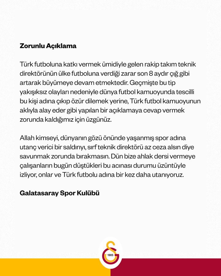 对方教练本应为土耳其足球做出贡献,但在过去的8个月中,他对国家足球造成的损害如雪崩般扩大,我们遗憾地看到,这个人在全球足球界因过去的不当事件而被记录在案,但俱乐部却发表声明,似乎在嘲弄土耳其足球界的智慧,而不是为其道歉。
