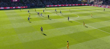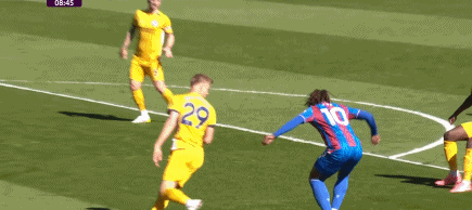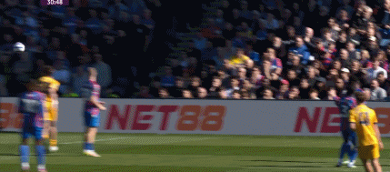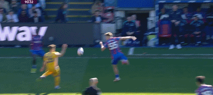第90分钟,格伊也因踢人吃到第二张黄牌被罚下,水晶宫最后时刻九人作战