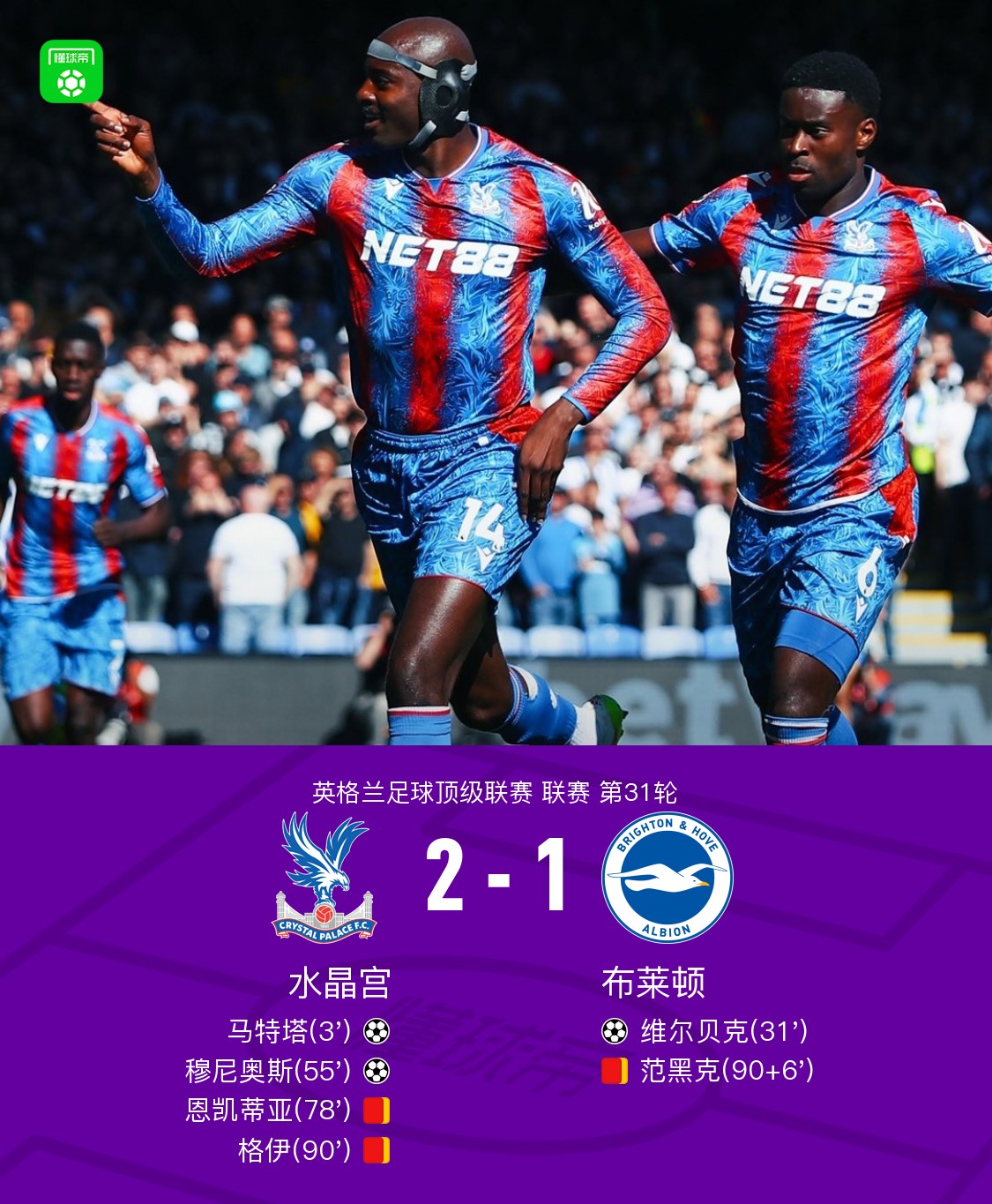 北京时间4月5日英格兰足球顶级联赛 联赛 第31轮,水晶宫主场对阵布莱顿。水晶宫马特塔破门,穆尼奥斯破门。布莱顿维尔贝克破门。最终比分水晶宫 2-1 布莱顿。