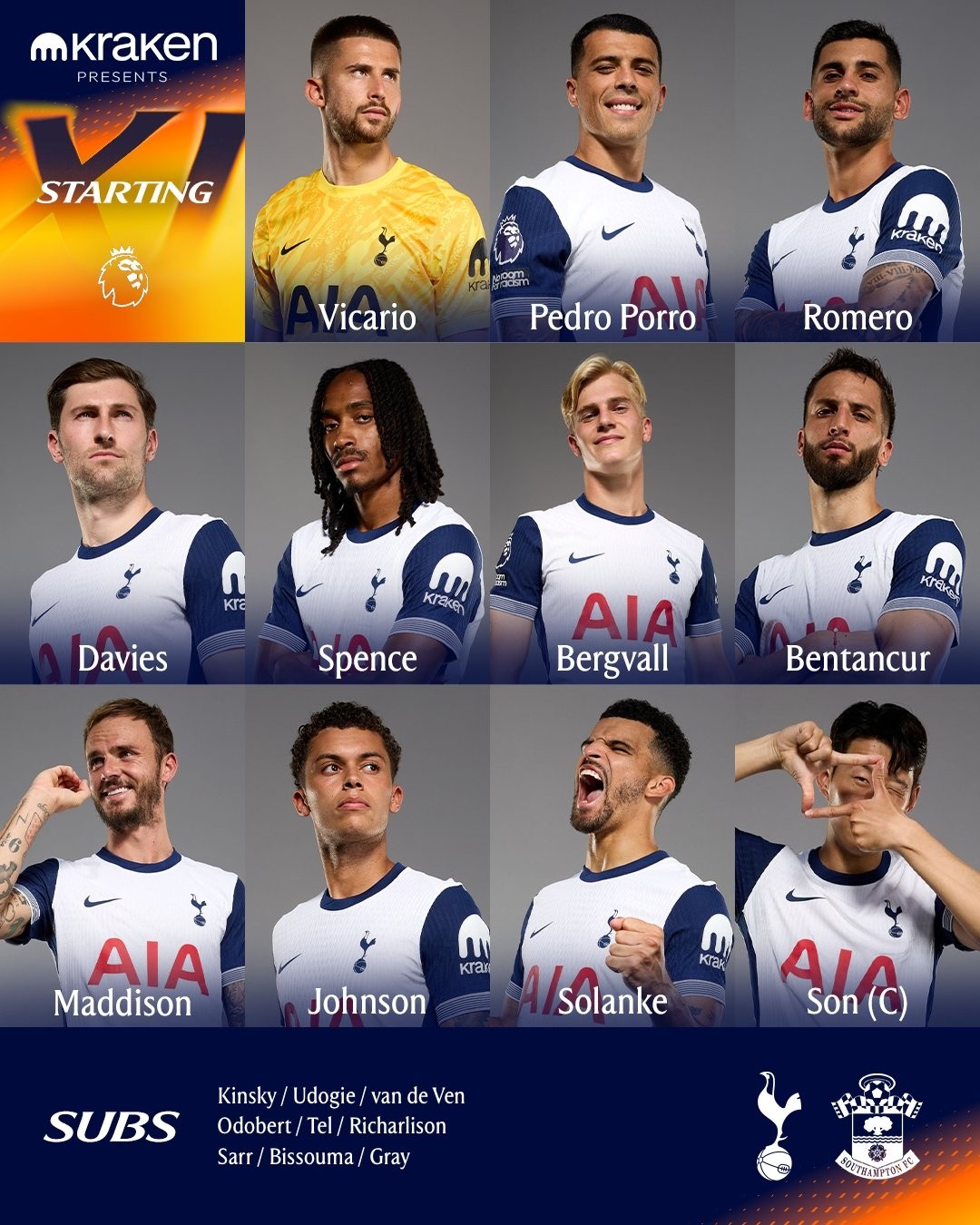 热刺vs南安普顿:孙兴慜、布伦南首发,本-戴维斯出战