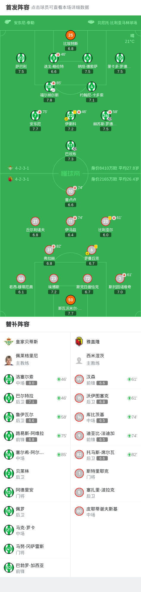 第24分钟,先拔头筹,福尔纳尔斯助攻巴坎布低射破门,贝蒂斯1-0