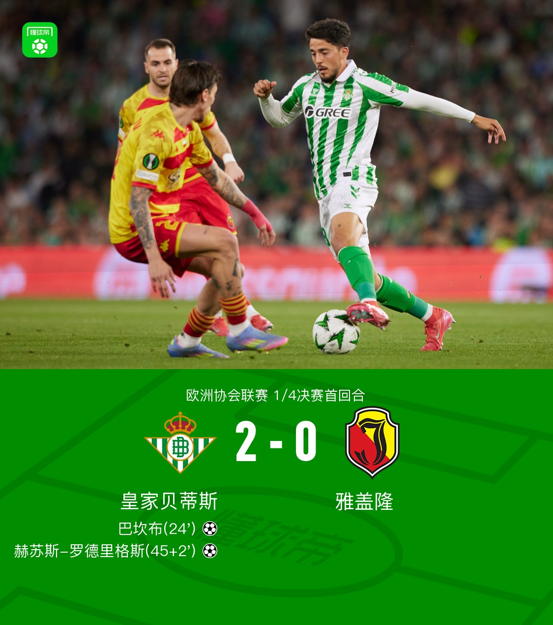 北京时间4月11日,欧洲协会联赛1/4决赛首回合展开争夺,皇家贝蒂斯迎战雅盖隆。比赛中,巴坎布接队友福尔纳尔斯的助攻率先为皇家贝蒂斯打破僵局,随后赫苏斯-罗德里格斯再入一球扩大领先优势。最终,皇家贝蒂斯以2-0战胜雅盖隆。
