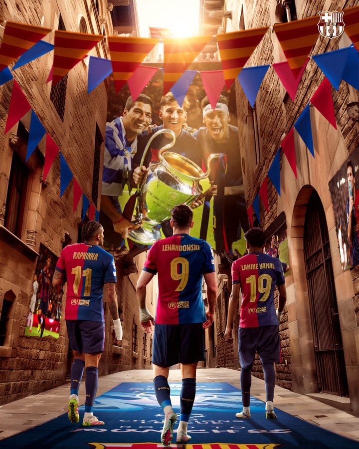 巴萨官方在社交媒体上晒出了欧冠海报,拉菲尼亚、莱万和亚马尔看着墙上MSN在2014-15赛季赢得欧冠冠军的照片,并配文:“他们创造了历史,现在轮到我们了”。