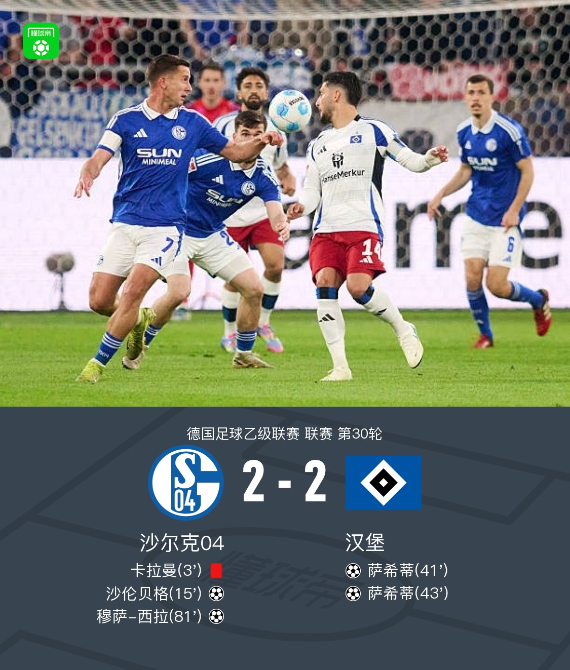 北京时间4月20日,德国足球乙级联赛第30轮,沙尔克04主场迎战汉堡。比赛中,沙尔克04的卡拉曼早早因犯规被红牌罚下。随后,沙伦贝格接托比亚斯-莫尔的助攻为沙尔克04取得领先。然而,汉堡迅速展开反击,萨希蒂分别接到东佩和柯尼希斯多费尔的助攻连入两球,帮助球队反超比分。比赛尾声,穆萨-西拉凭借甘滕拜因的助攻为沙尔克04扳平比分。最终,双方以2-2握手言和。