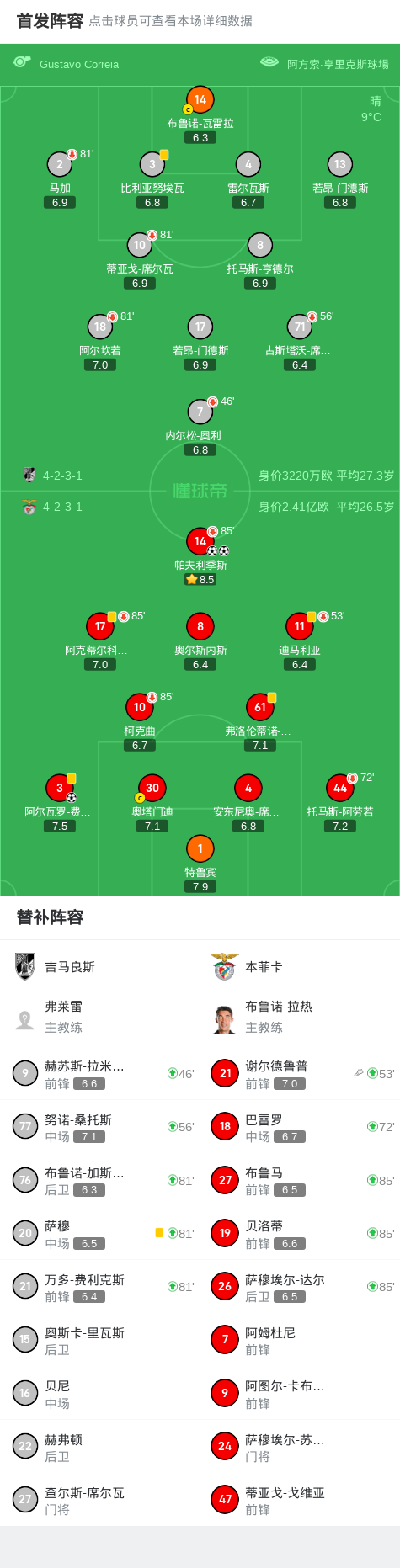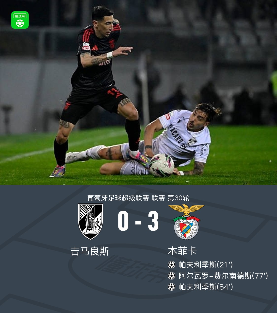 北京时间4月20日葡萄牙足球超级联赛 联赛 第30轮,吉马良斯主场对阵本菲卡。本菲卡帕夫利季斯梅开二度,阿尔瓦罗-费尔南德斯破门。最终比分吉马良斯 0-3 本菲卡。