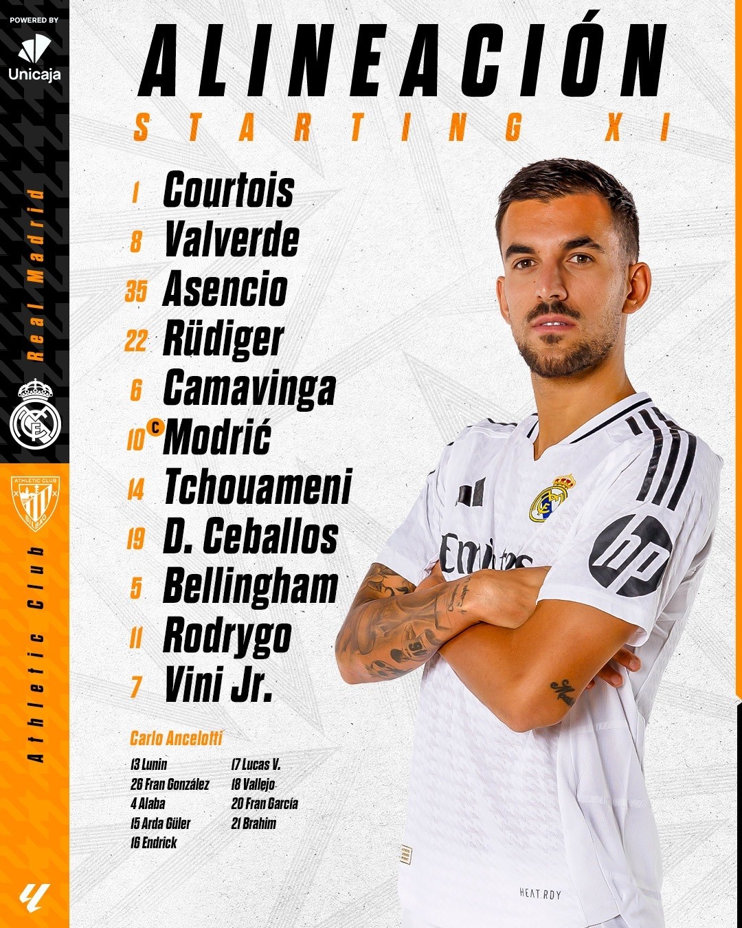北京时间4月21日03:00,西甲 第32轮,皇家马德里主场迎战毕尔巴鄂竞技,赛前双方球队首发名单公布如下: