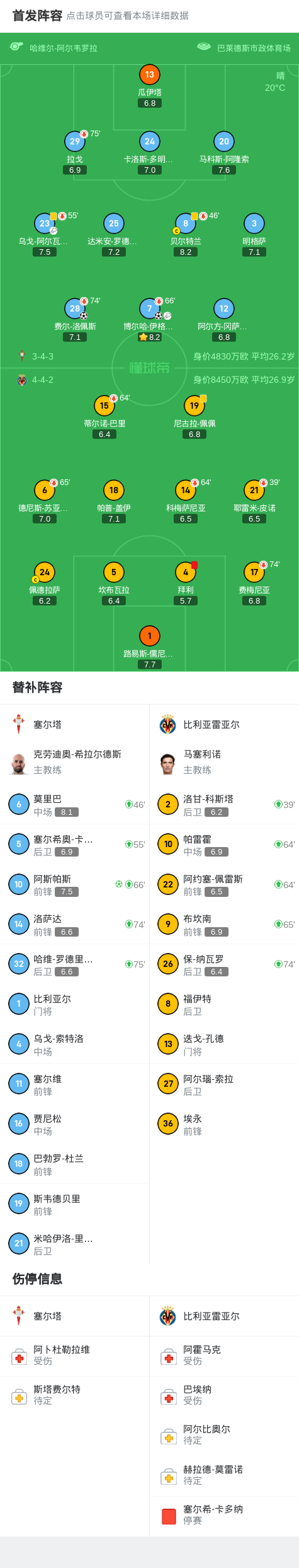 塞尔塔3-0十人比利亚雷亚尔,洛佩斯、伊格莱西亚斯破门,阿斯帕斯点射
