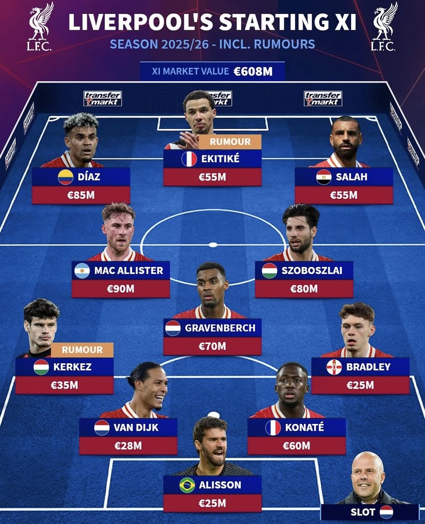 阿利松;康纳-布拉德利、科纳特、范戴克、科尔克兹(绯闻对象);索博斯洛伊、赫拉芬贝赫、麦卡利斯特;萨拉赫、埃基蒂克(绯闻对象)、路易斯-迪亚斯