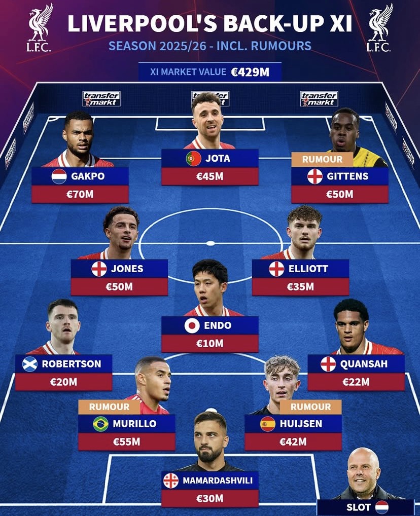 马马尔达什维利;夸安萨、赫伊森(绯闻对象)、穆里略(绯闻对象)、罗伯逊;埃利奥特、远藤航、柯蒂斯-琼斯;比诺埃-吉滕斯(绯闻对象)、迪奥戈-若塔、加克波