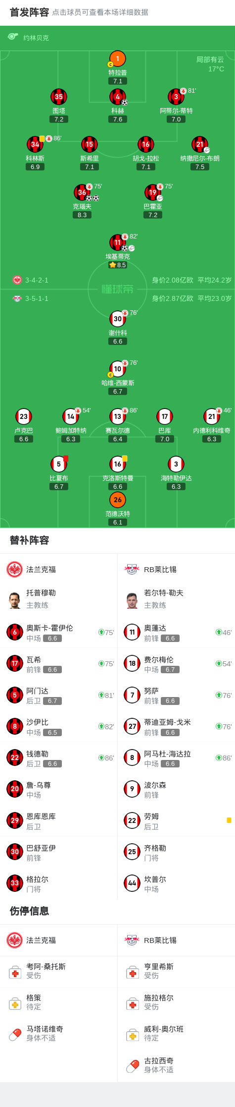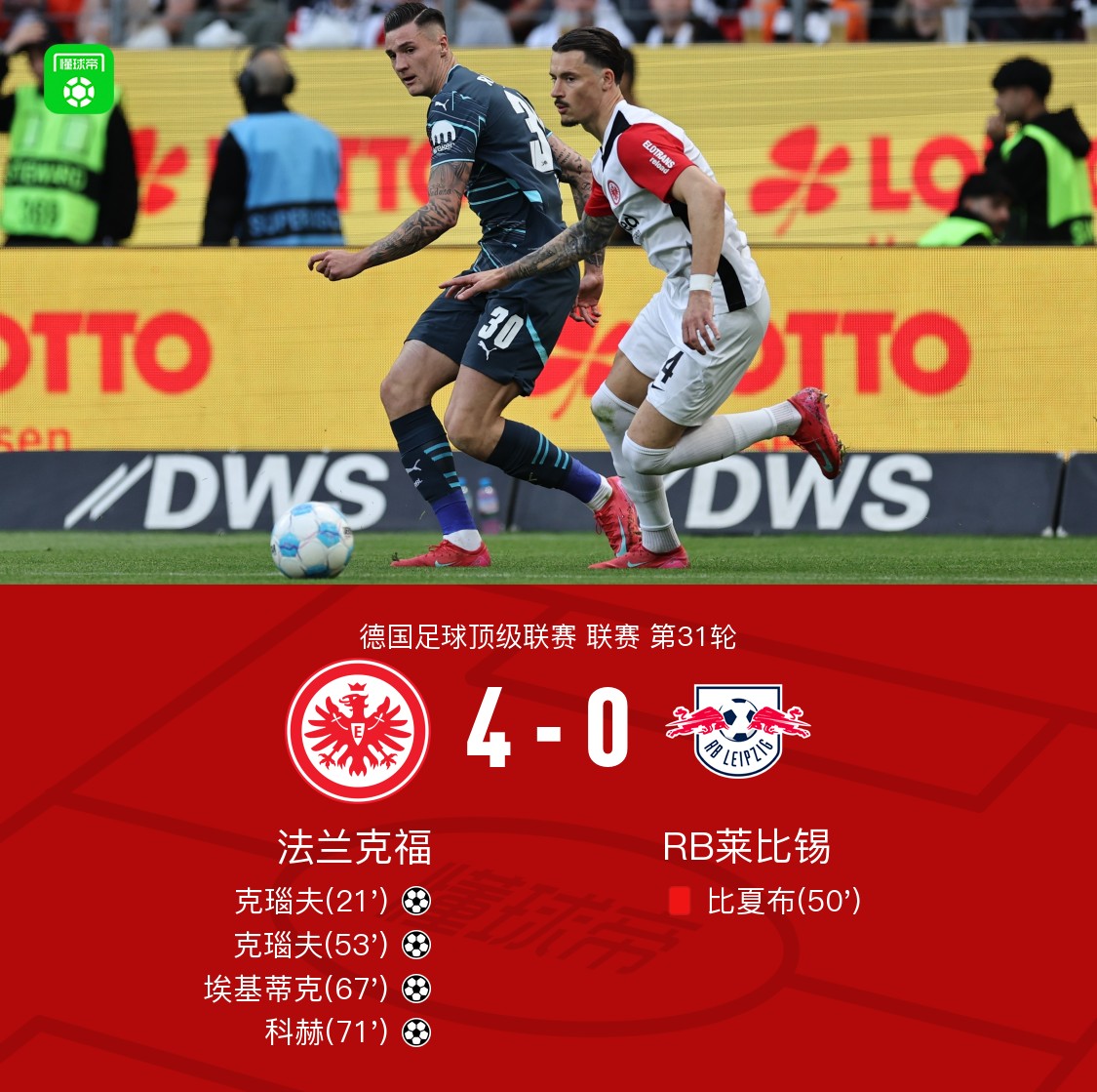 法兰克福4-0十人莱比锡,克瑙夫双响+造红牌,埃基蒂克传射