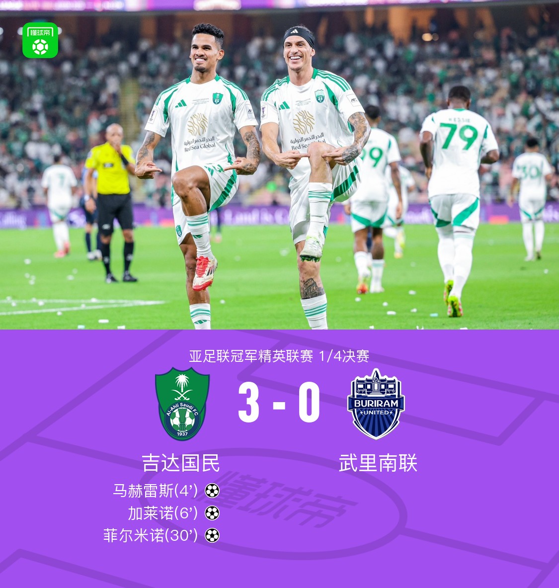 亚足联冠军联赛1/4决赛,吉达国民对阵武里南联。比赛中,马赫雷斯闪击,随后加莱诺扩大比分,菲尔米诺再下一城。最终,吉达国民以3-0战胜武里南联,晋级亚冠精英四强。