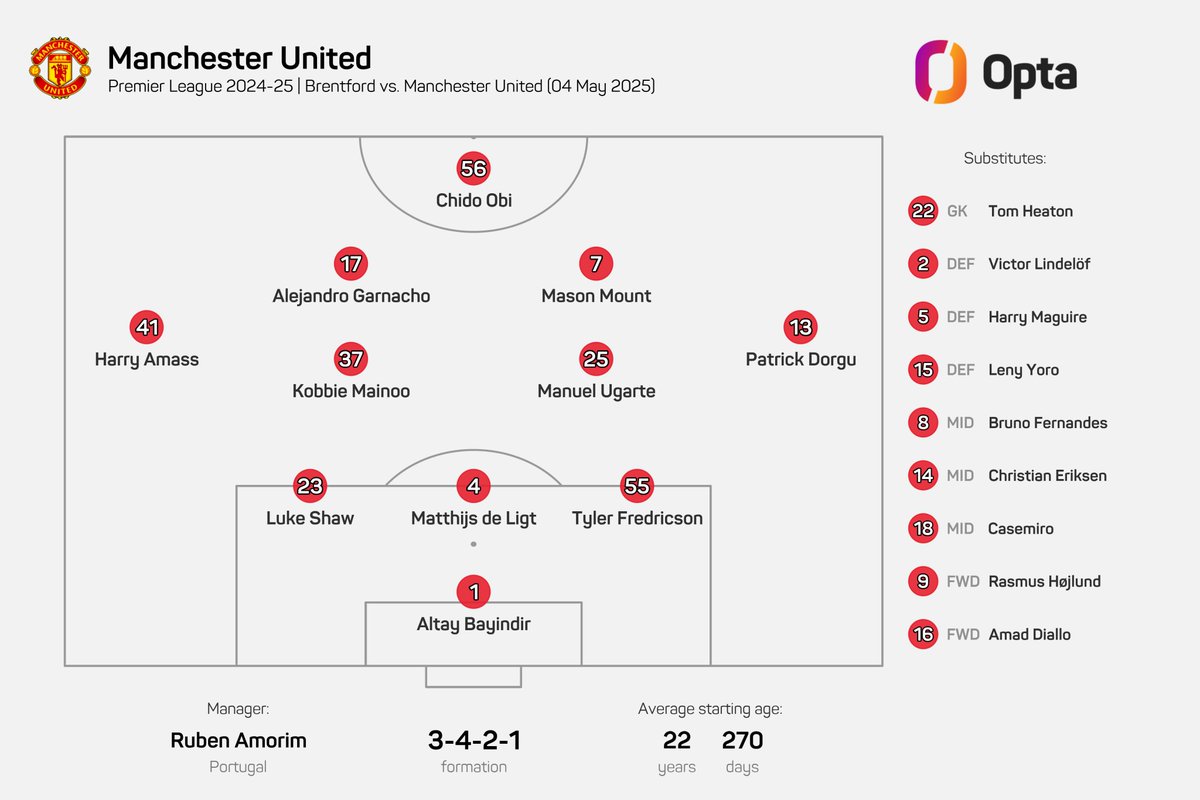 英超第35轮,曼联客场对阵布伦特福德,此役曼联首发平均年龄为22岁270天,这是英超历史上第三年轻的首发。
