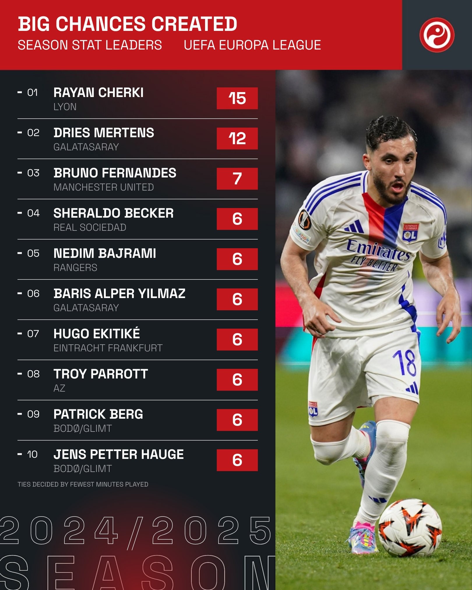 据统计,里昂的谢尔基是本赛季欧联杯截至目前创造绝佳机会次数最多的球员。