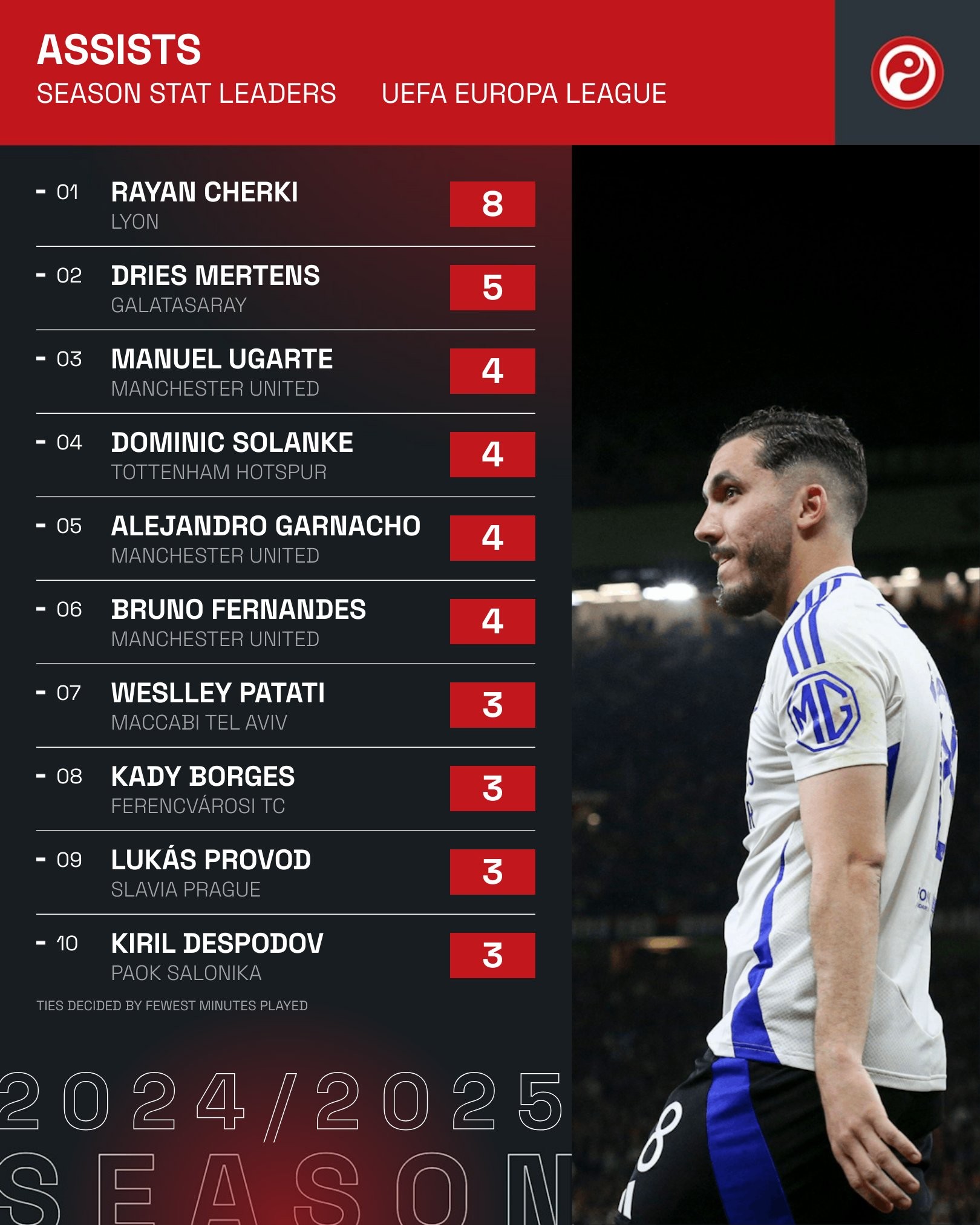 2024/25赛季欧联杯助攻榜(截至5月9日,次数相同时出场时间较少者排名靠前)