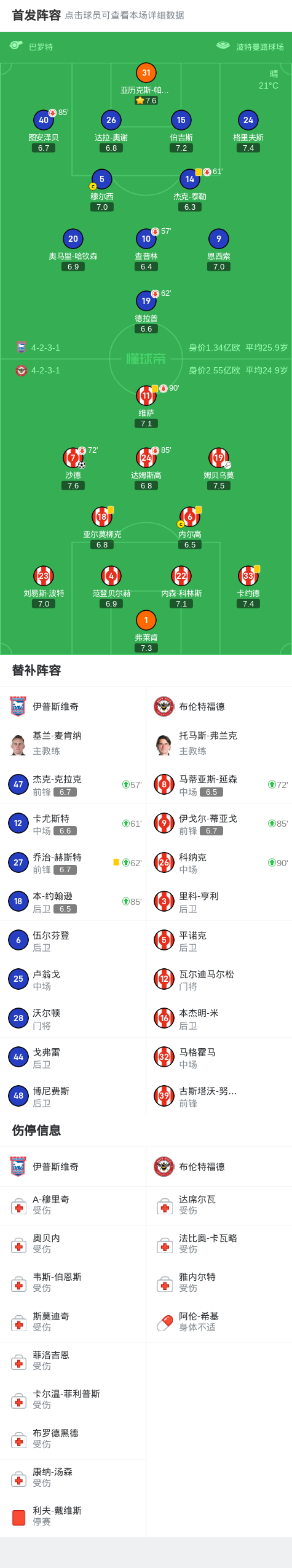 布伦特福德1-0客胜伊普斯维奇,沙德头球制胜