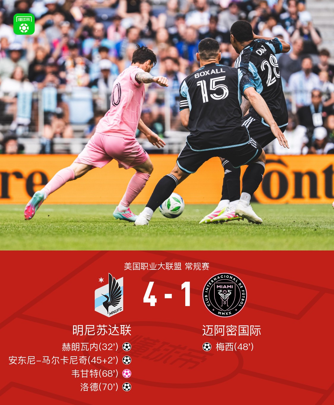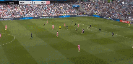 迈阿密国际1-4明尼苏达联,阿尔巴助攻梅西打进挽回颜面一球