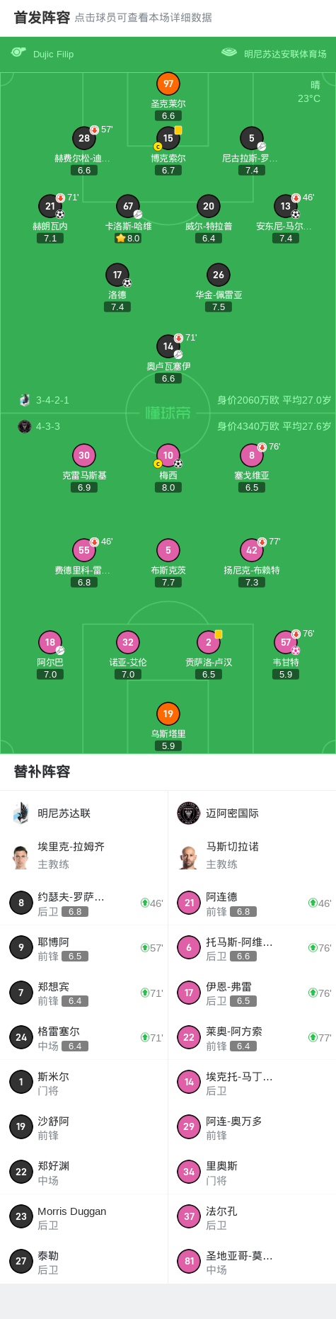 北京时间5月11日美国职业大联盟 常规赛,明尼苏达联主场对阵迈阿密国际。上半场卡洛斯-哈维助攻赫朗瓦内破门打破僵局,随后安东尼-马尔卡尼奇破门再进一球。下半场,阿尔巴助攻,梅西破门扳回一分。明尼苏达联角球,韦甘特头球解围不慎乌龙。2分钟后,奥卢瓦塞伊助攻洛德再进一球。最终,明尼苏达联4-1大胜迈阿密国际。