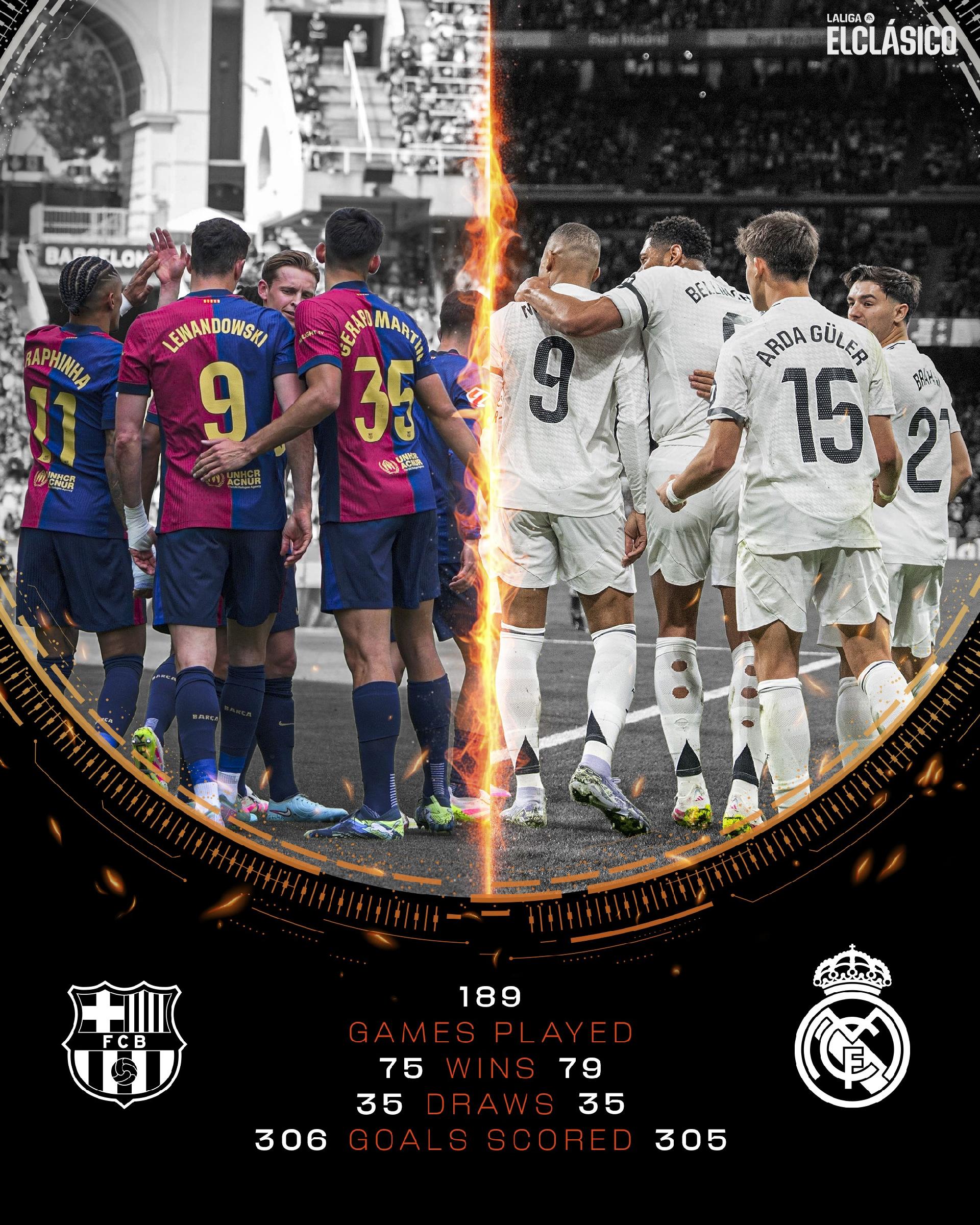 西甲官方晒国家德比历史战绩:巴萨75胜306球,皇马79胜305球