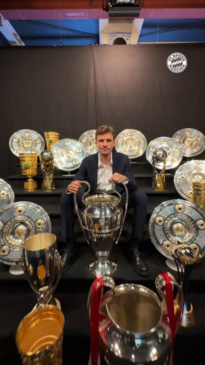 赛后,拜仁官方也是晒出了穆勒与拜仁征战多年所获部分奖杯的大合照。