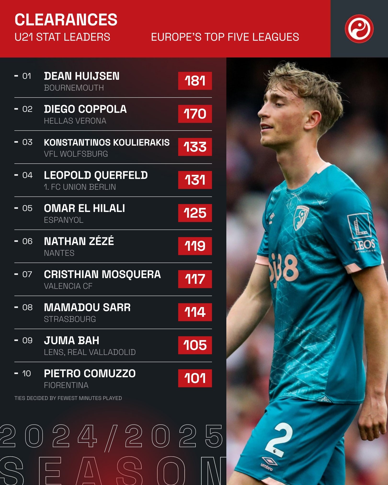 据统计,赫伊森是本赛季欧洲五大联赛解围次数最多的U21球员。