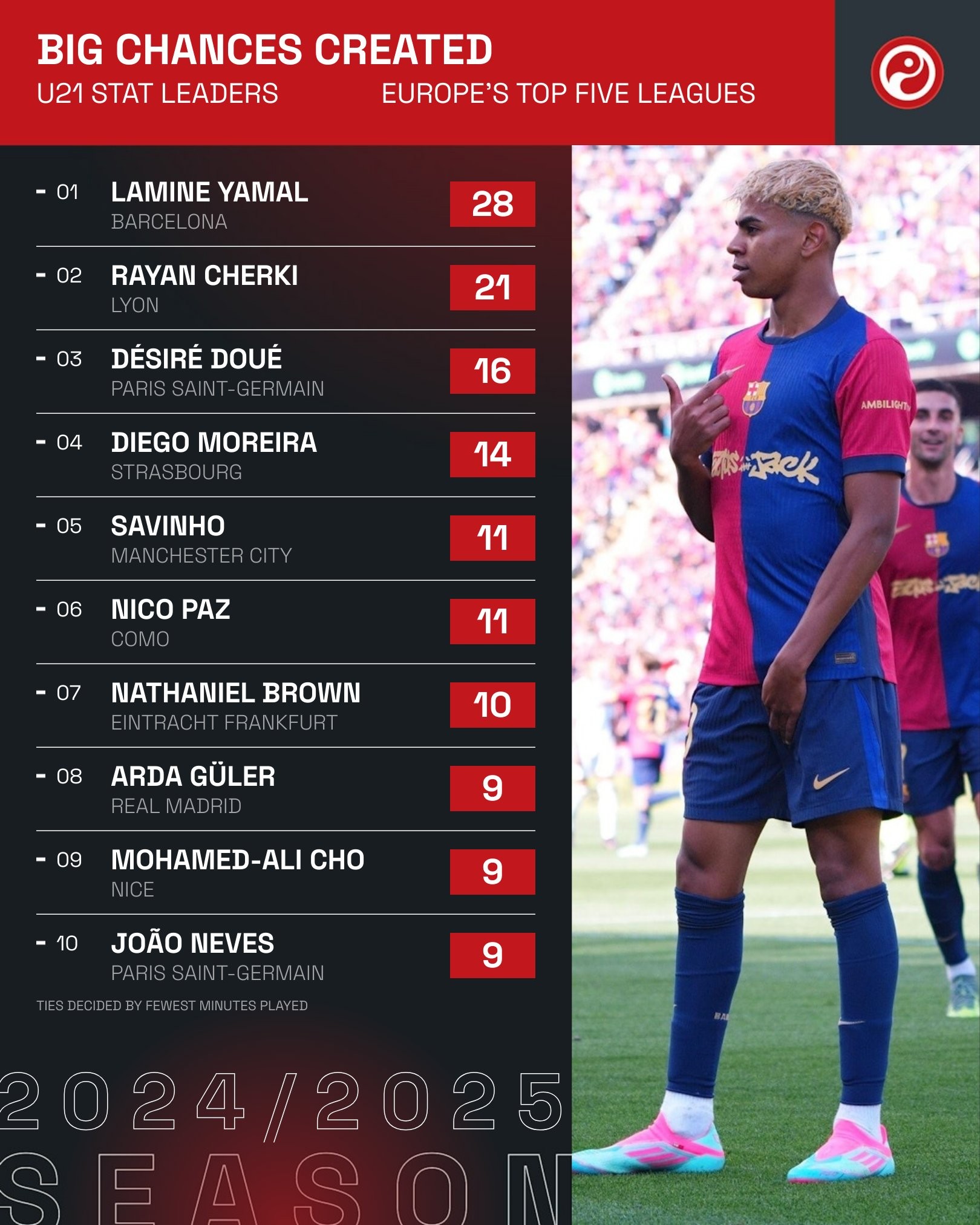 2024/25赛季五大联赛U21球员创造绝佳机会次数排行榜(截至5月12日,次数相同时出场时间较少者排名靠前)