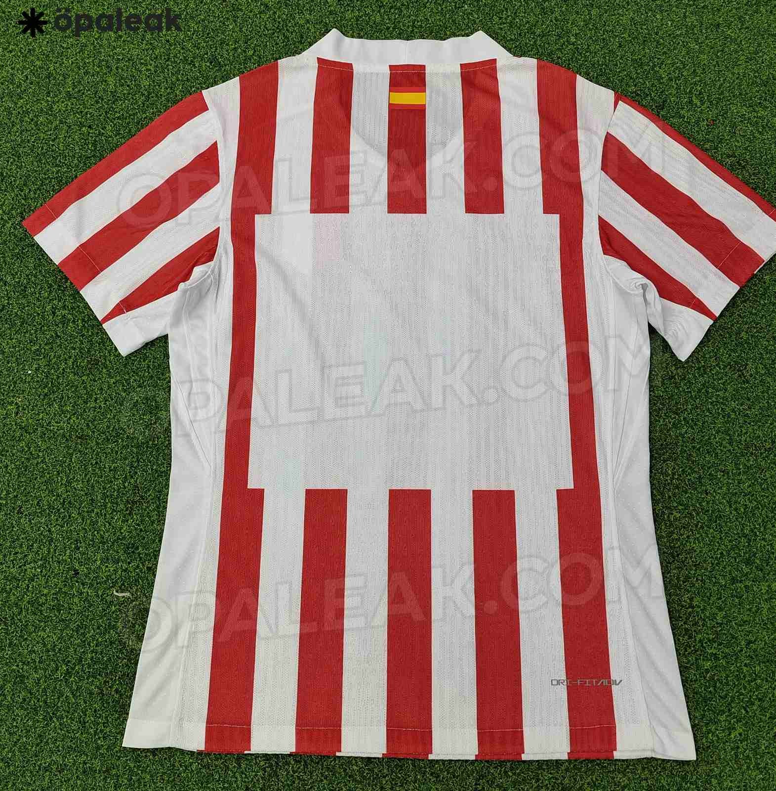 新赛季马竞主场球衣在全新2025赛季球衣模板的基础上采用传统的红白间条衫设计,选择了白色底板+红色竖条纹点缀的设计方案,领口处加入了灵感来源于T90的假翻领设计。胸前队徽使用原色版本,外加金色勾边,球衣赞助商LOGO以及胸前广告使用蓝色。球衣后领位置加入无国徽版本的西班牙国旗图案,背号部分做出留白处理,以保证球迷能够看清号码。