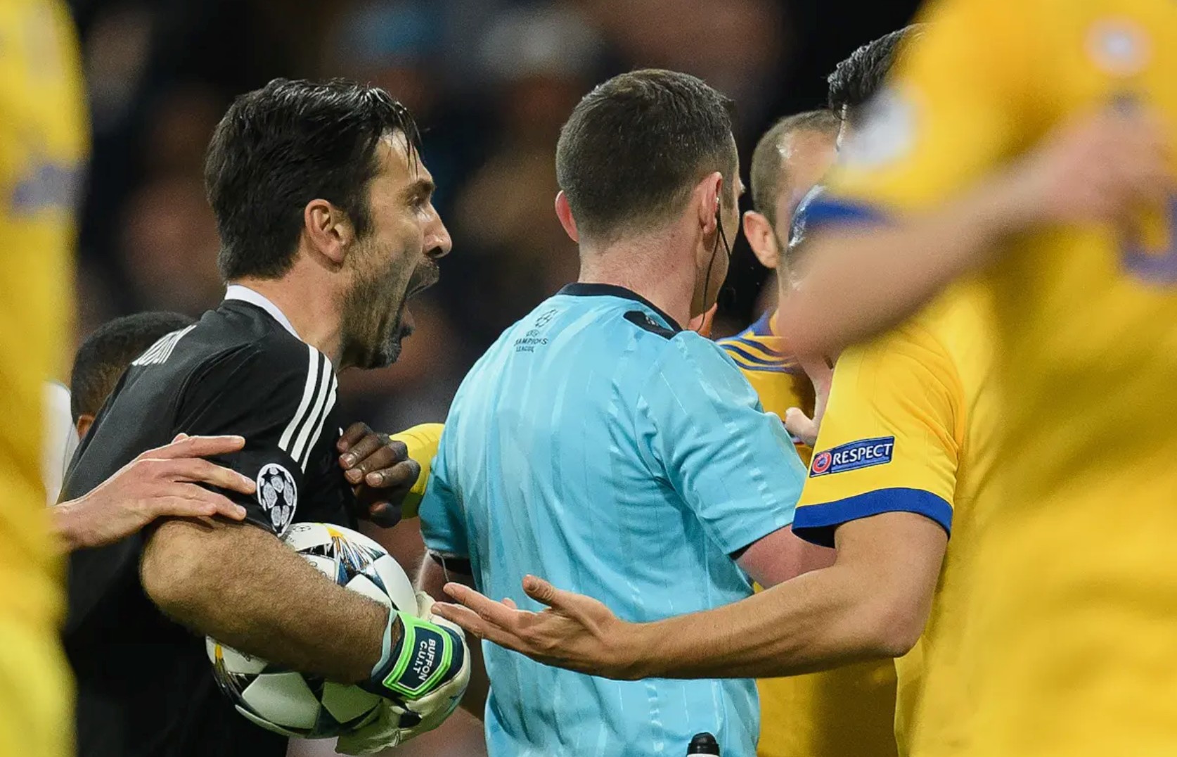 在2018年欧冠1/4决赛次回合,当值主裁迈克尔-奥利弗最后时刻判给皇马一粒点球,直接导致尤文翻盘希望破灭的情况下,布冯曾愤怒地对记者说道:“你得是个禽兽才能那样做,你心里的位置装着的是一个垃圾桶。”