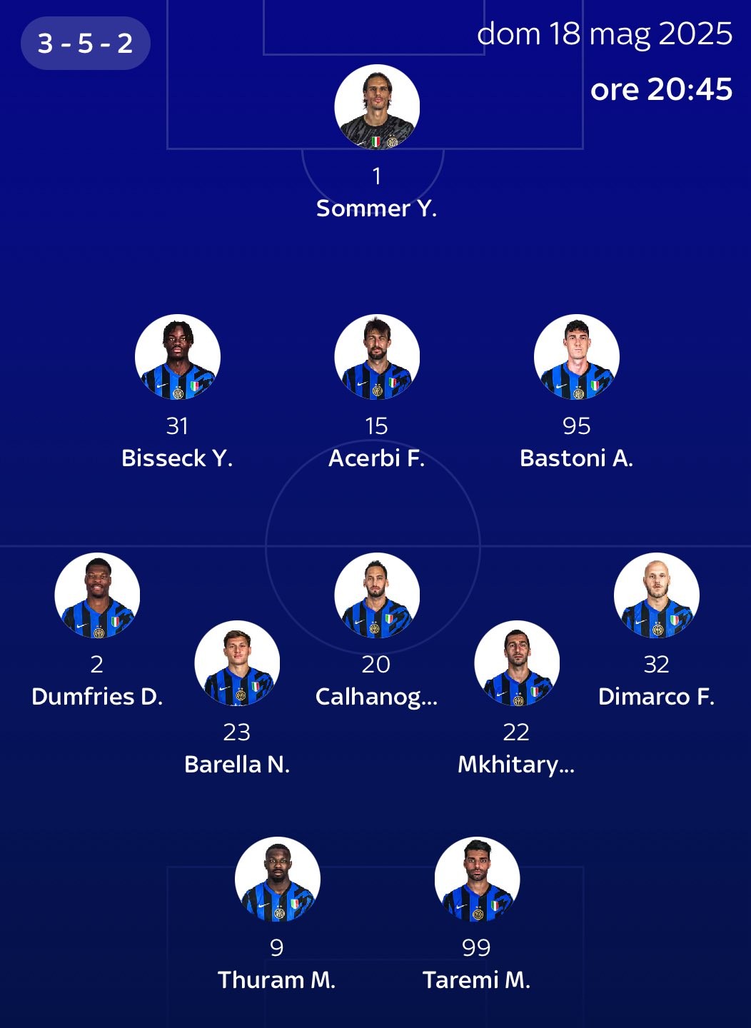 索默;比塞克、阿切尔比、巴斯托尼;邓弗里斯、巴雷拉、恰尔汗奥卢、姆希塔良、迪马尔科;马库斯-图拉姆、塔雷米