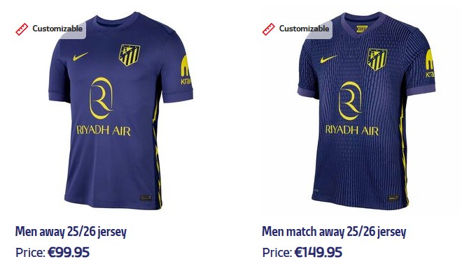 这件客场球衣目前已经上架马竞官方商城。球迷版售价为99.95欧元,球员版售价为149.95欧元。