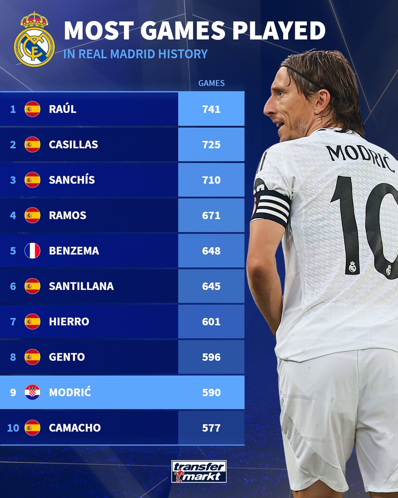 自从2012年夏天加盟至今,莫德里奇已经在各项赛事当中为皇马出场590次,他在这份排行榜上位列第9。如果能在西甲末轮的比赛中上场,并在接下来的世俱杯中获得一些出场机会的话,他仍然有可能超越596次出场的亨托升至第8。
